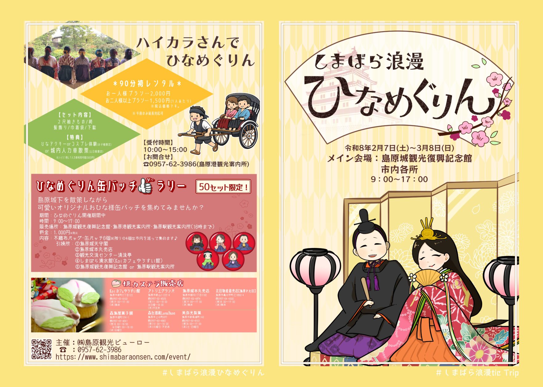 「しまばら“浪漫”ひなめぐりん」とは、島原の歴史的な街並みを舞台に、数多のひな人形を愛でながら歩く春の散策イベントです。期間限定のオリジナル企画が目白押し!