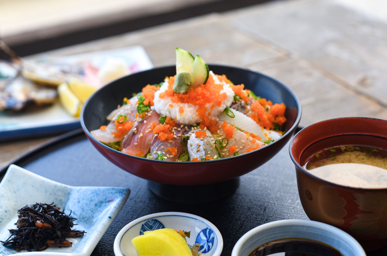 客席からは絶景のロケーションでお食事することが出来ます。人気No.1の海鮮丼を是非食べにお越しください。