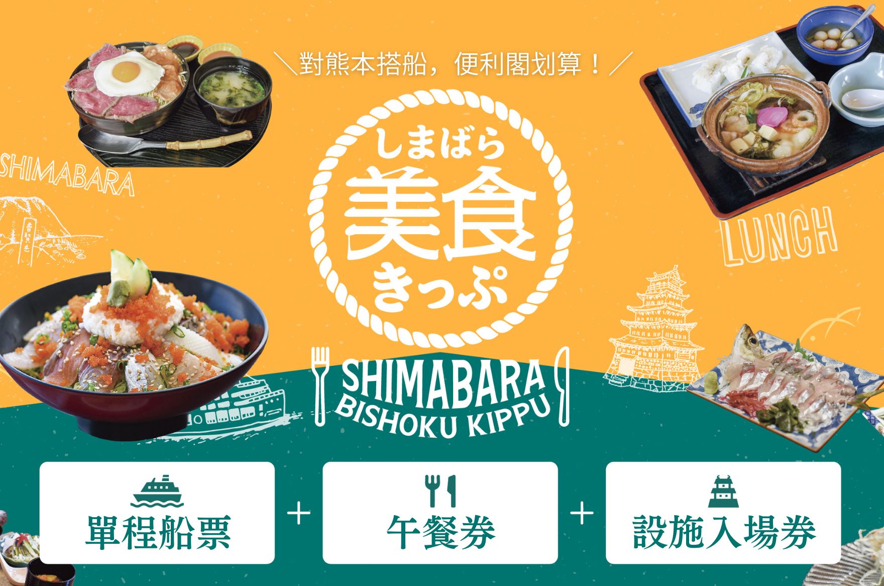 船旅、午餐、觀光名勝。將島原魅力濃縮於一張的「島原美食套票」,為您的旅程提供貼心支援!